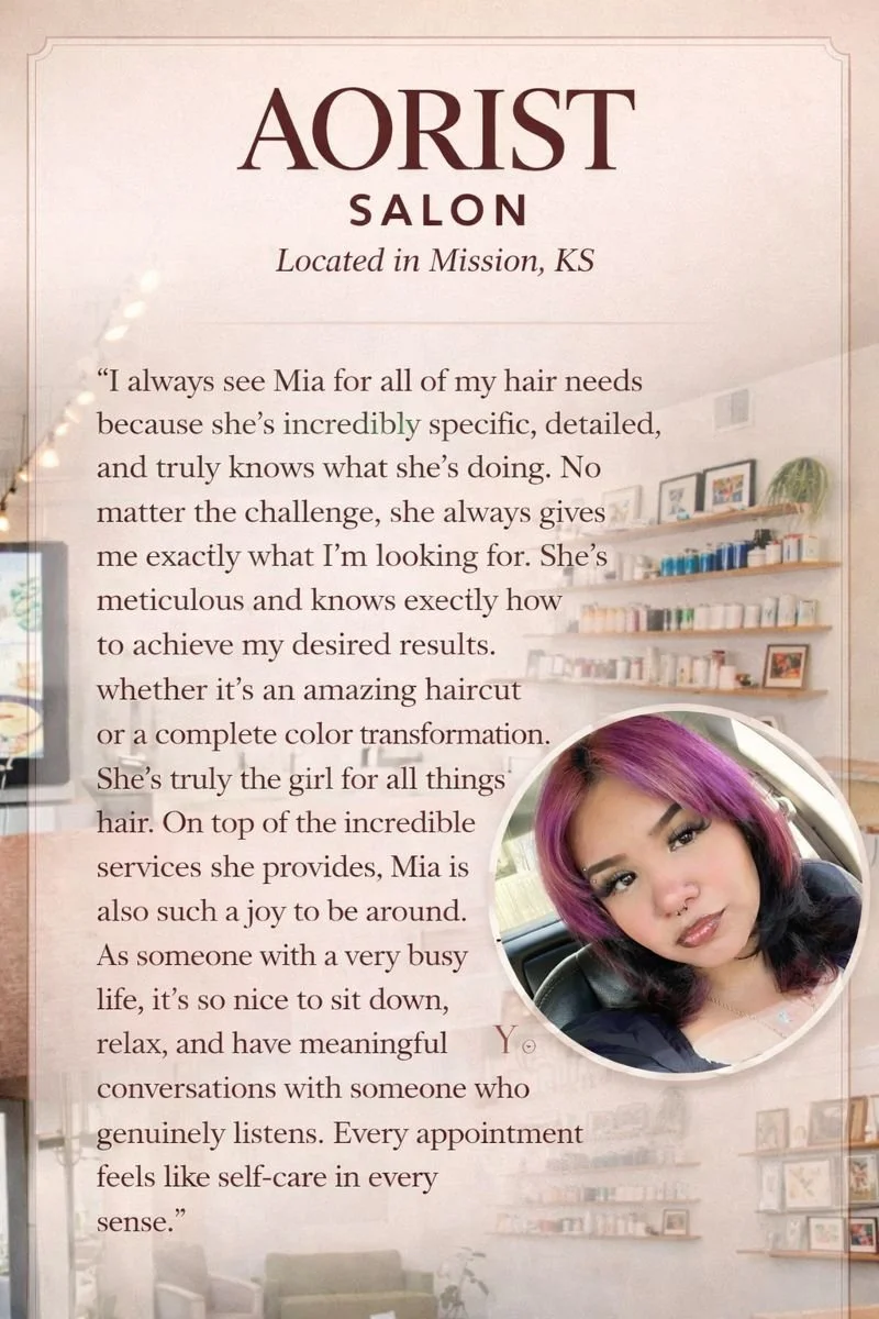 Mia is a stylist at Aorist Salon known for her attention to detail and thoughtful, care-driven approach. She specializes in refresh appointments, maintenance color, and healthy hair routines.